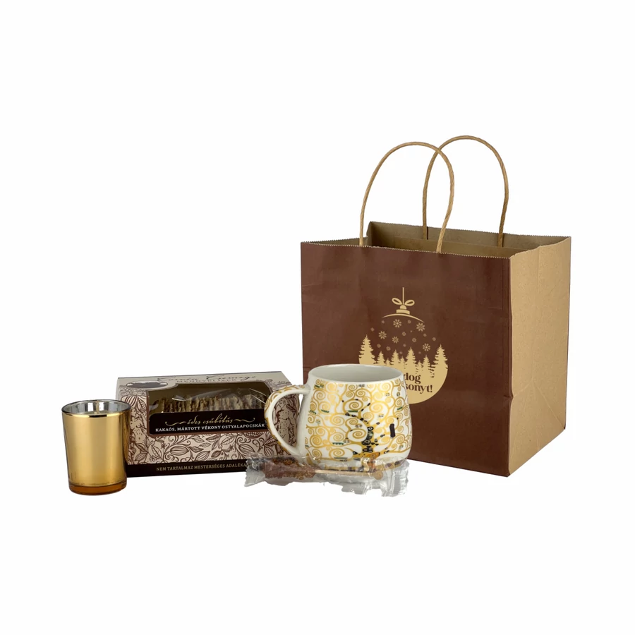 Varázsoljon meghitt pillanatokat az ünnepekre ezzel a bájos csomaggal! Az Aranyos ünnep I. minden apró részlete a karácsony hangulatát idézi: a gyertya lágy fénye, a kandiszpálca édes pillanatai és a csokoládéba mártott ostyalapok igazi melegséget hoznak a téli estékbe. A stílusos életfa bögre minden kortyot különlegessé tesz, miközben a sodrott füles papírtáska eleganciát ad az ajándékozásnak. Kész ajándékcsomagként tökéletes választás családnak, barátoknak vagy céges partnereknek, akik értékelik a gondosan válogatott finomságokat és a meghitt, ünnepi pillanatokat.
