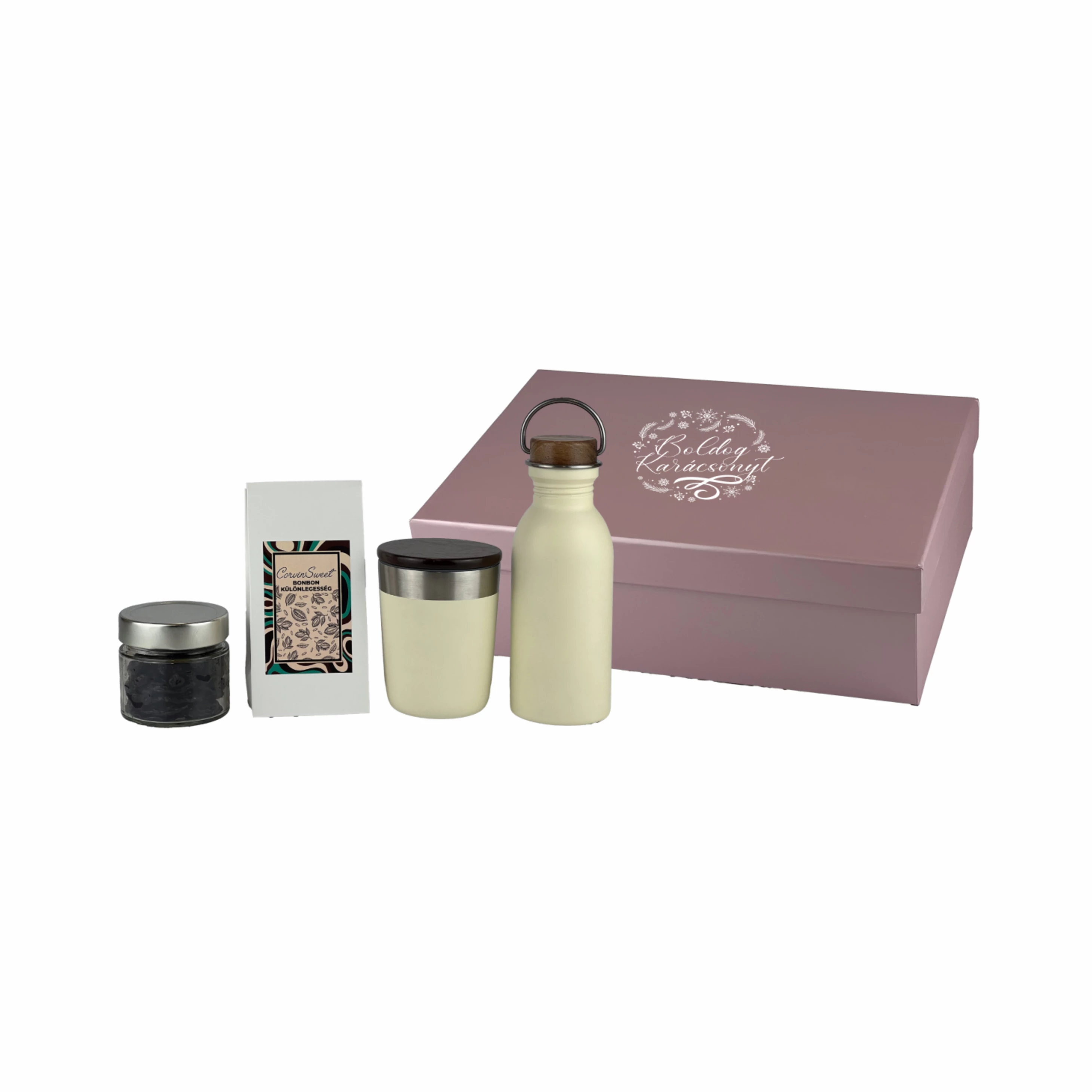 A csomag tartalma: Mályva papírdobozban, aszalt szilva és áfonya keverék, Corvin Sweet bonbon különlegesség 60 g, prémium minőségű, újrahasznosított rozsdamentes acél kulacs, akácfa kupakkal és hordozó füllel 500 ml, duplafalú vákuumos ivópohár újrahasznosított rozsdamentes acélból, légmentesen záródó akácfa fedéllel.