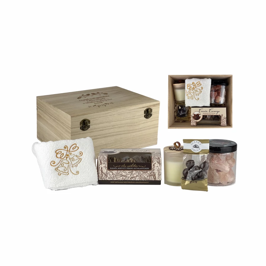 A csomag tartalma: Kapcsos fadobozban, Corvin Csemege (csokoládéba mártott ostyalapok) 100 g, kézműves bonbon különlegesség 60 g, vanília illatú gyertya üveg tartóban,hópelyhes fa fedéllel, frotír kéztörlő hímzett karácsonyi mintával 30x30 cm, himalája fürdősó 500 g.