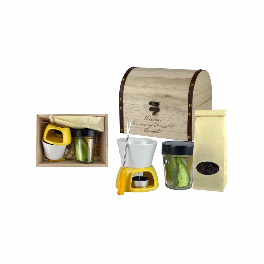 A csomag tartalma: Kapcsos fa ládikában, kerámia fondue szett, aszalt gyümölcs mix üvegben 100 g, csokipehely papírtasakban 35 g.