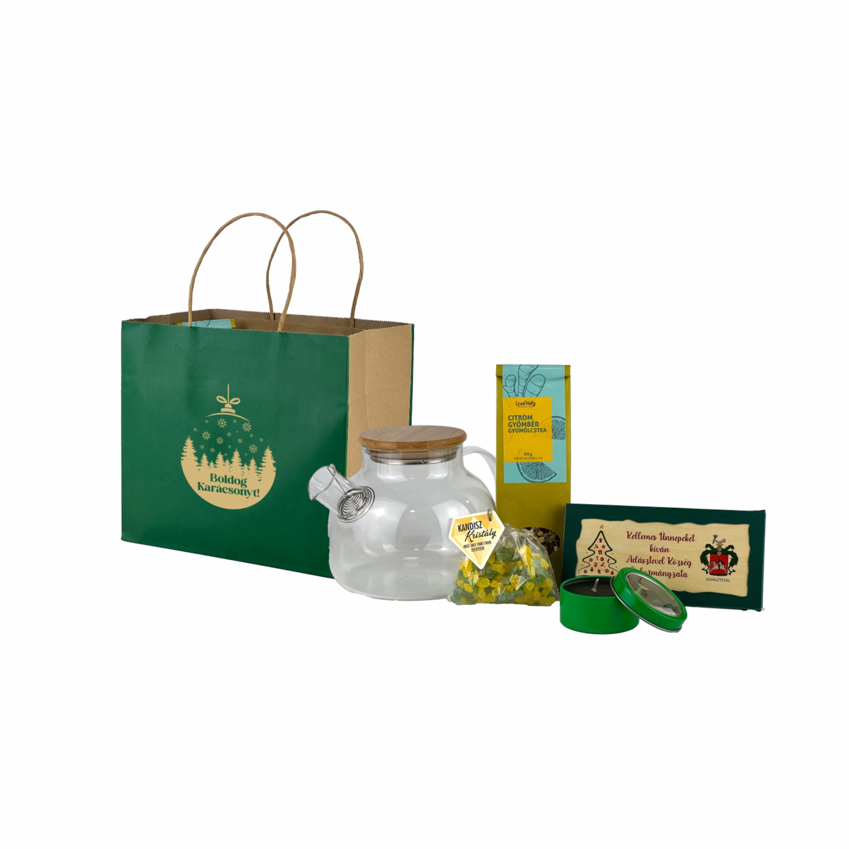 Engedje, hogy a karácsony csendes pillanatai kibontakozzanak egy finom tea mellett! A Karácsonyi Teázó csomag minden részlete az ünnepi meghittséget idézi: a bambusz tetővel zárható teáskanna és a szűrővel könnyedén készítheti el a citrom–gyömbér teát, miközben a kandiszpálca édes íze és a Choco Postcard csokoládé apró örömei teljes élménnyé varázsolják a pillanatot. A lágy fényű gyertya és a stílusos papírtáska eleganciát ad az ajándékozásnak, így azonnal átadható karácsonyi meglepetésként. Ez a karácsonyi ajándékcsomag tökéletes választás családnak, barátoknak vagy céges partnereknek, akik értékelik a nyugalmat, a minőségi finomságokat és a meghitt ünnepi pillanatokat.