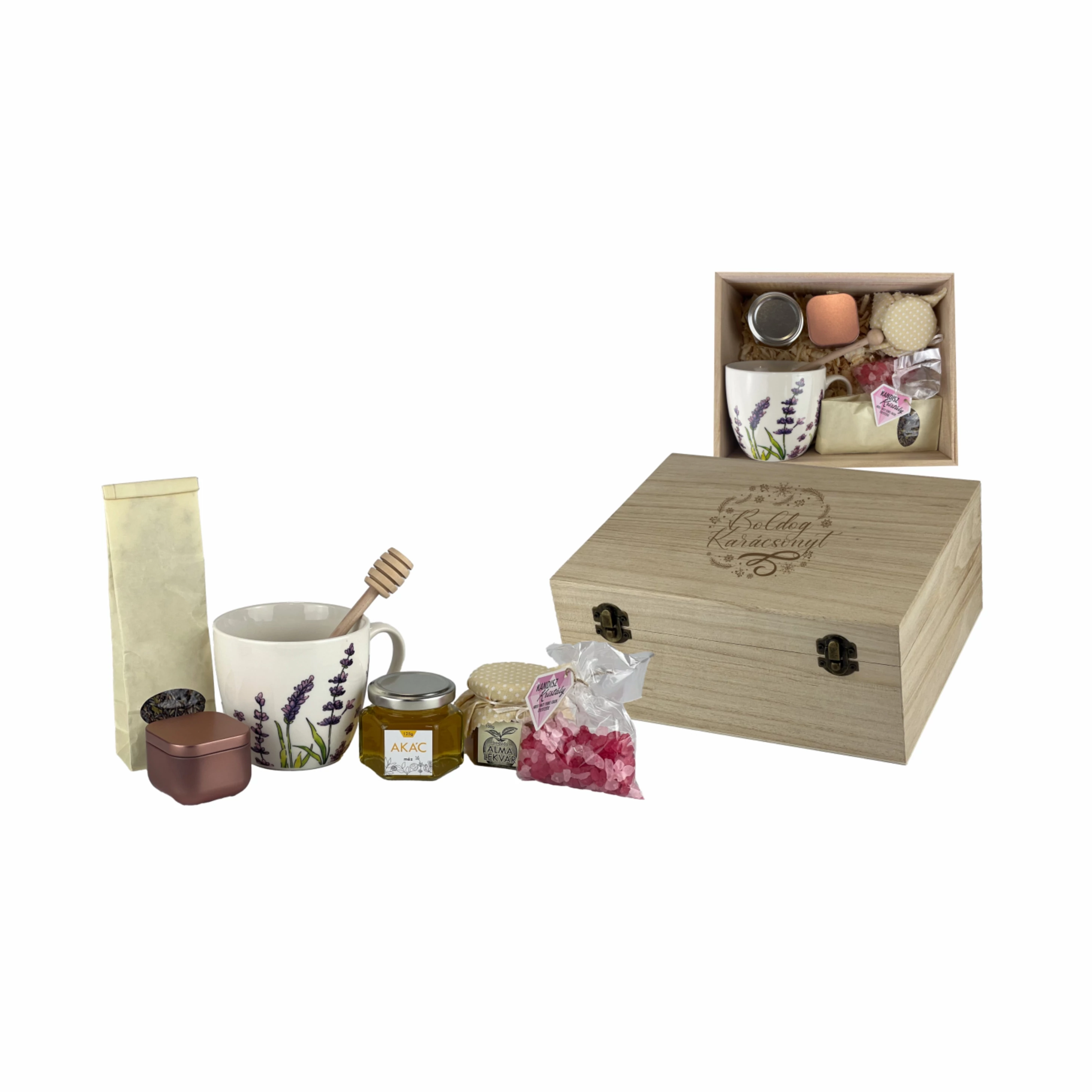 A csomag tartalma: Kapcsos fadobozban, levendula mintás bögre 470 ml, levendula tea, akácméz 125 g, fa mézcsurgató, kandisz kristály 50 g, bodzás almalekvár 100 g, vanília illatú gyertya fém tartóban.