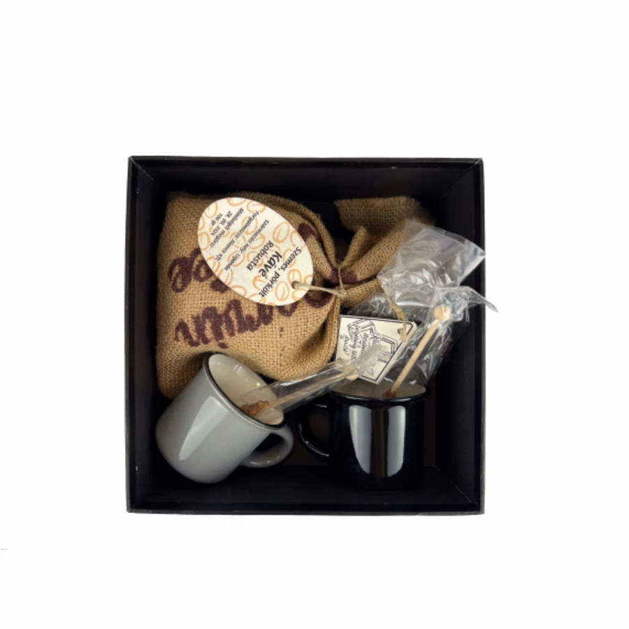 A csomag tartalma: Fekete papírdobozban, Corvin Coffee - szemes kávé különlegesség 100 g, 2 db nosztalgikus - eszpresszós kerámia bögre, fekete peremmel - 60 ml, kávélikőrös bonbon csomag 60 g, 2 db kandiszpálca.